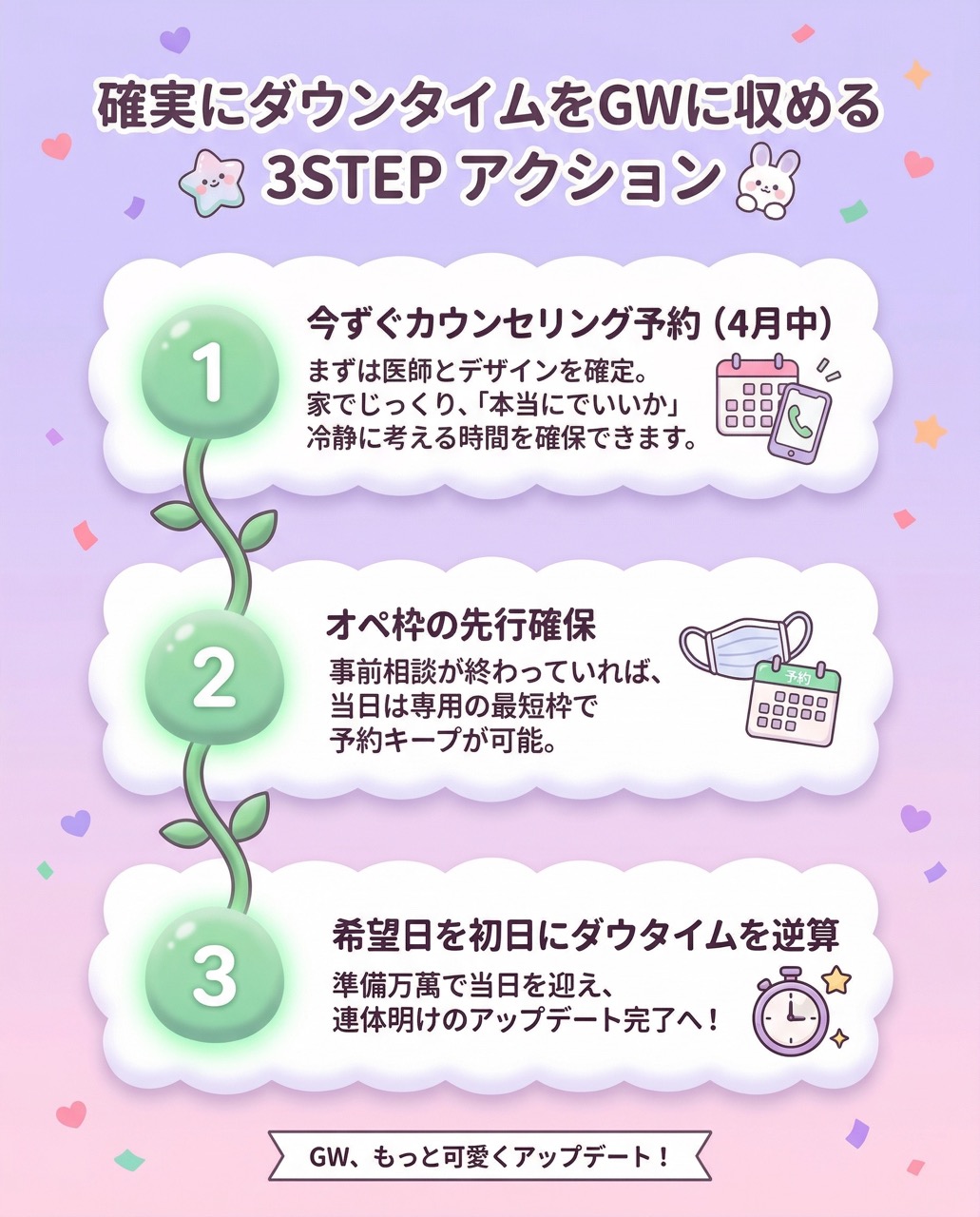 「この日からダウンタイムに入りたい!」という希望があるなら、4月中の事前カウンセリングが絶対条件です💨
