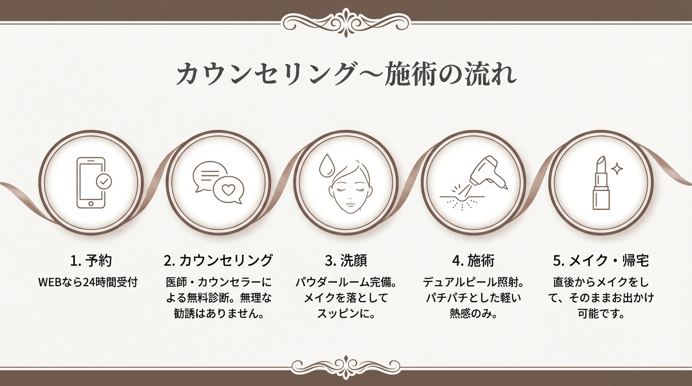 🌸経験豊富な医師による無料カウンセリングと充実の保証制度で、あなたの「なりたい美肌」を一緒に叶えます。