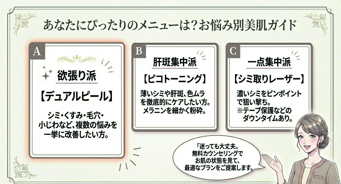 当院大人気のデュアルピールは、2種類のレーザーを組み合わせた次世代治療!