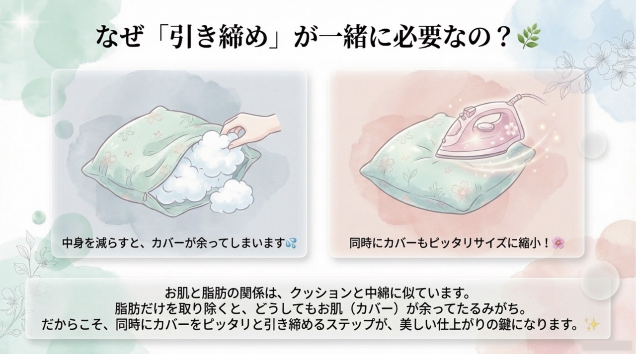 中身を減らすだけだと、カバー(お肌)が余って「たるみ」の原因に。