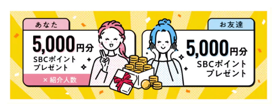 まだ湘南美容クリニックをご利用いただいたことがないご友人様をご紹介いただくごとに、お互いに5,000円分のSBCポイントを付与しております!