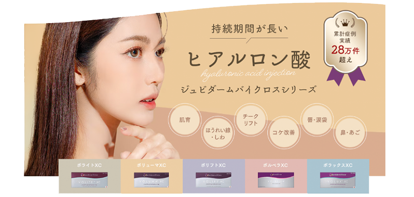 ジュビダームバイクロシリーズのヒアルロン酸で初!FDAの認可がおりた、ボトックスで知られる医薬大手、米国アラガン社製の安全性の高いヒアルロン酸です。しわの深さに合わせて、注入量をカスタマイズできます。適切な量を注入することでよりナチュラルにシワのくぼみをなだらかにし、若々しい印象になります。