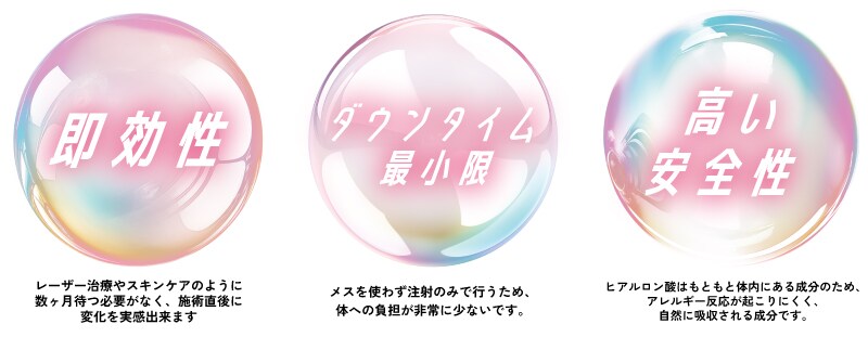 ヒアルロン酸は、もともと人間の皮膚や関節などに存在する、水分を蓄える力の高い物質です。そのためアレルギー反応が起こりにくく、時間が経つと自然に体内に吸収されるため、美容医療の中でも非常に安全性が高い治療として知られています。