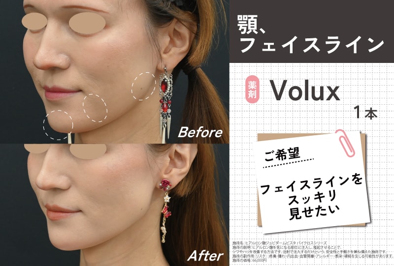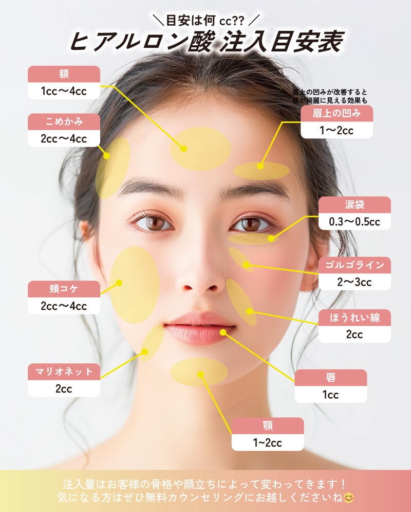 お客様の骨格や顔立ちによって、注入量は前後いたしますが、大体の目安をこちらにまとめてみました。ぜひご参考ください。