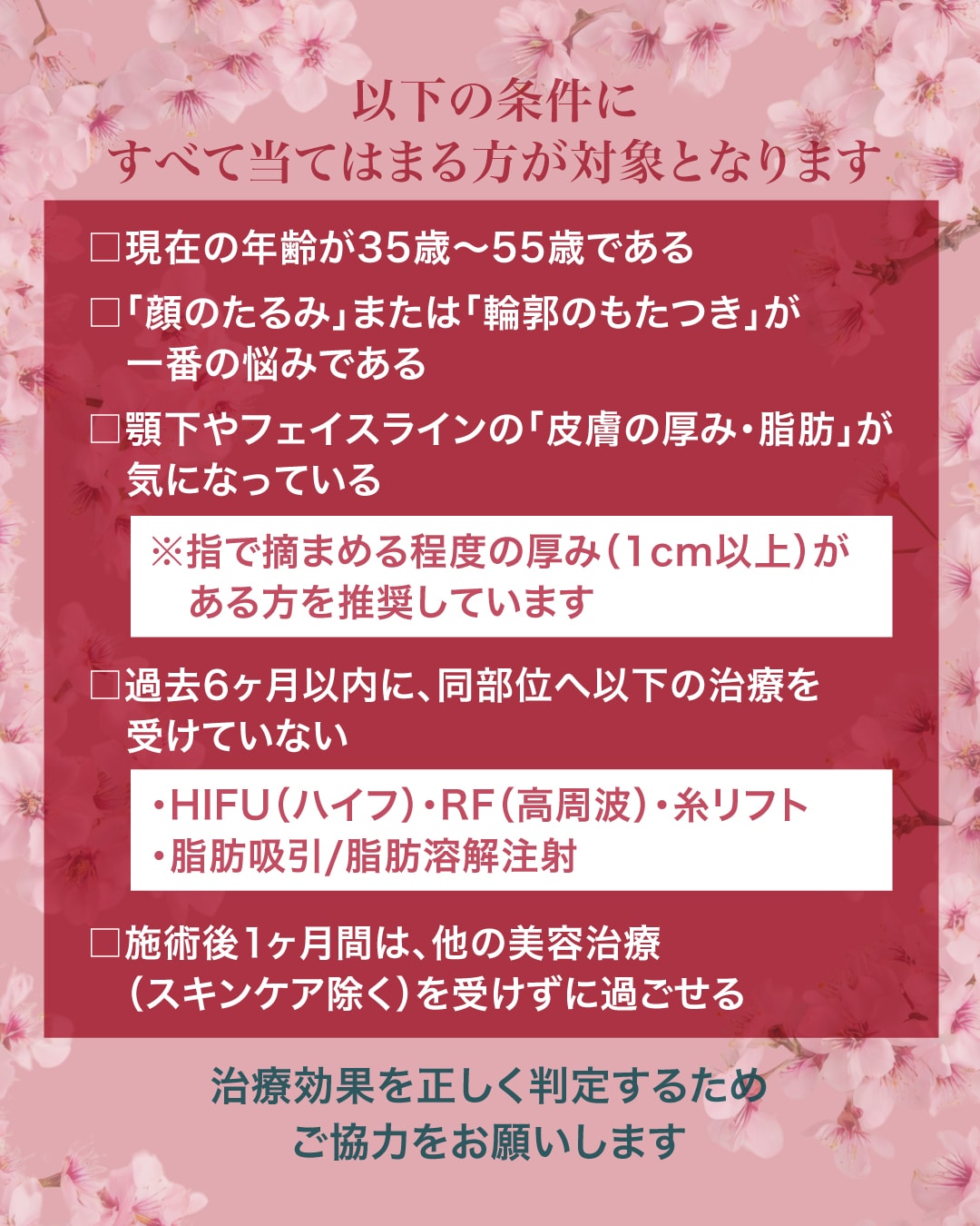 • 期間: 過去6ヶ月以内に同部位のHIFUや糸リフト等を受けていない方