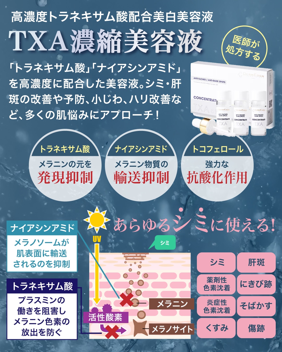 TXA濃縮美容液(ダームエデン)は、トラネキサム酸5%、ナイアシンアミド10%を配合している「医師の診察が必要」な美容液です。