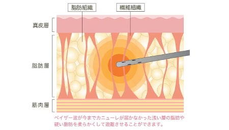 従来の方法(美ボディ脂肪吸引など)と決定的に違うのは、「ベイザー波」という特殊な超音波を使用する点です。