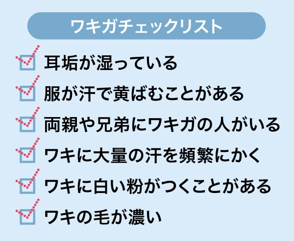 それぞれチェックに2つ以上当てはまる場合は、ワキガ・多汗症の可能性があります。