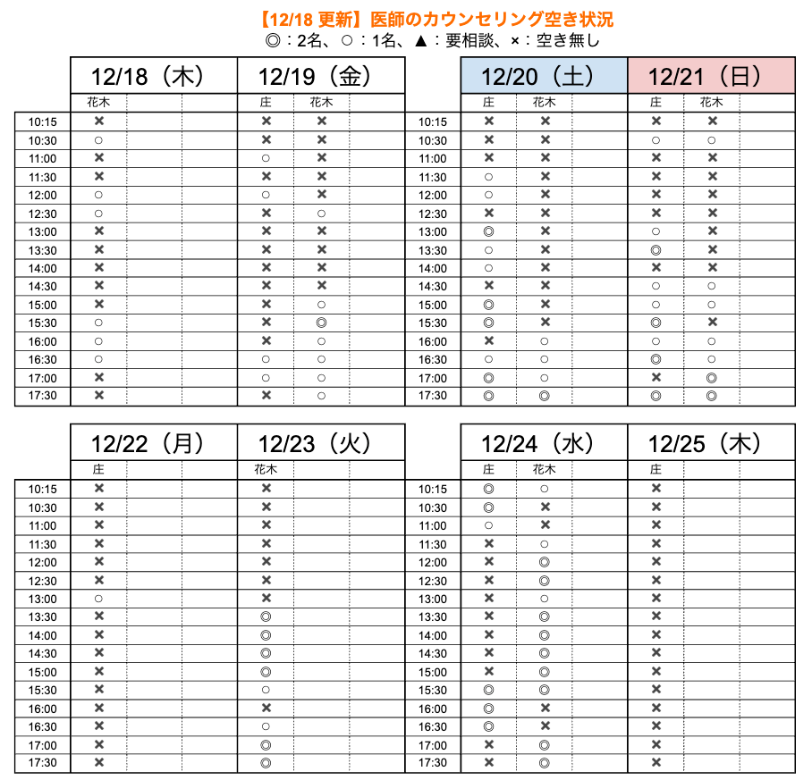 【12/18 更新】医師のカウンセリング&医療脱毛空き状況