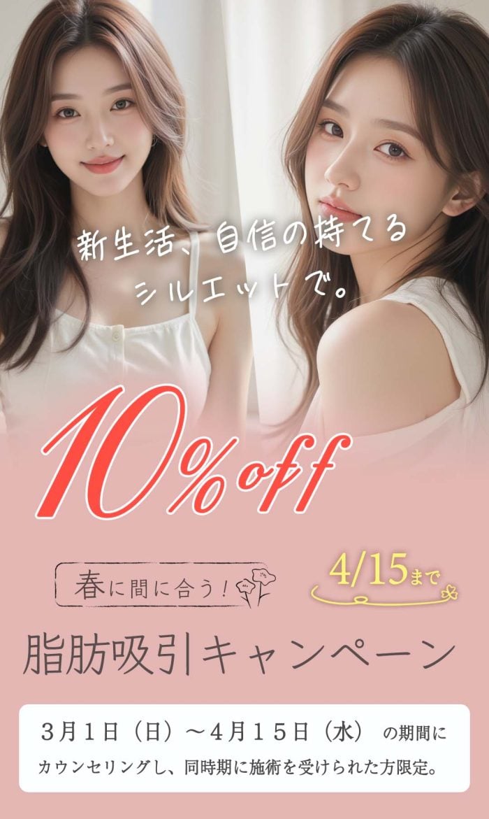 湘南美容クリニック岡山院では、3月1日から4月15日までの期間で「脂肪吸引・脂肪吸引注射の10%オフキャンペーン」を実施中です。
