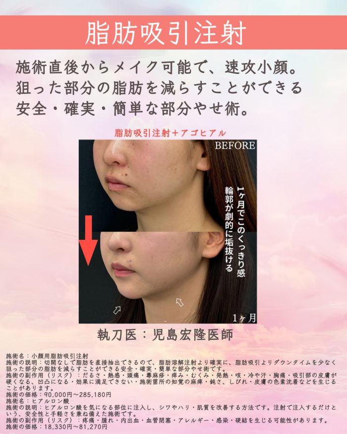 当院でできる施術は 「脂肪吸引注射」 「美ボディ脂肪吸引」 「ベイザー脂肪吸引」 「アキーセル脂肪吸引」