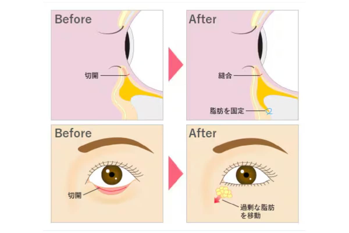 施術の説明:目の下の脂肪を取るのではなく、膨らんでいるところから窪んでいるところに移動させ、美しく整える方法です。