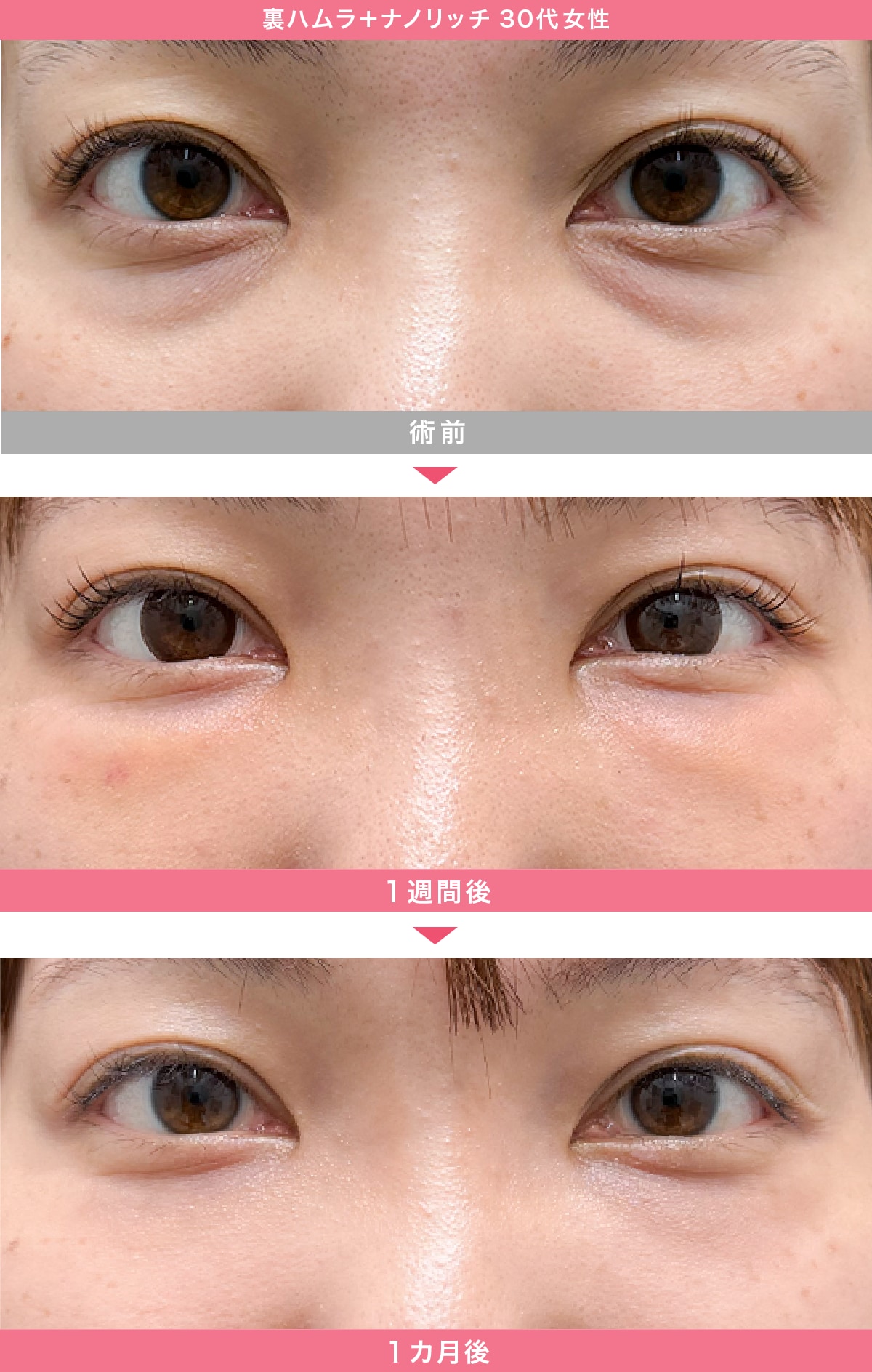 ハムラ法で膨らみとくぼみをフラットにし、ナノリッチをプラスすることで色味や小ジワの改善に。