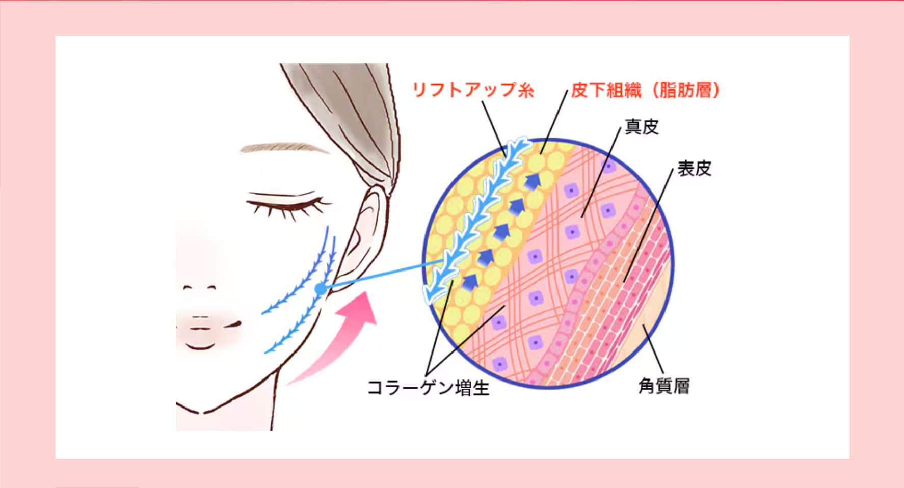 また、糸を挿入することで皮膚の組織が活性化し、コラーゲンが増生されることでお肌のハリ・ツヤアップも期待できます。