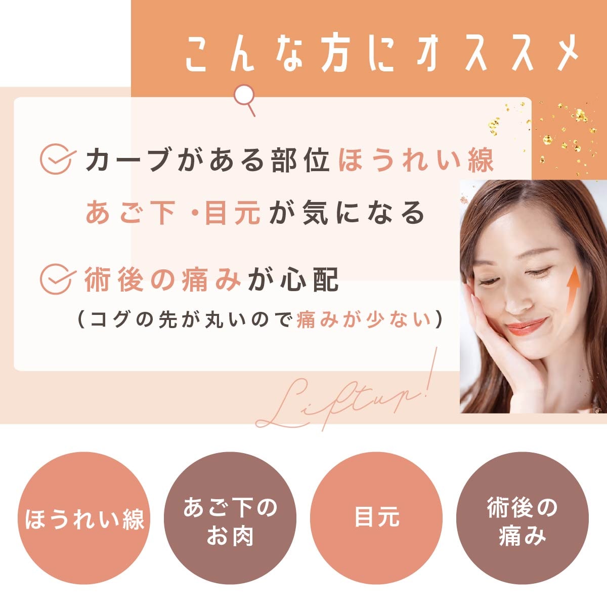 カーブがある部位のほうれい線あご下・目元のたるみ改善に適しています。