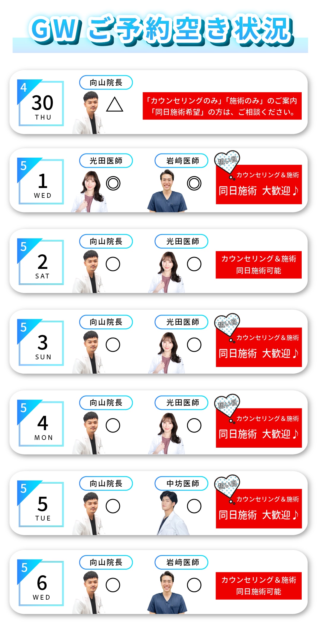 ゴールデンウィーク中も連日営業中で、*ご予約もカウンセリングと施術を同日に取ることも可能です!
