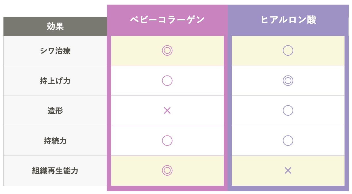 ★ベビーコラーゲン(○:適している) ヒアルロン酸のような物理的なリフトアップ力は強くありません。