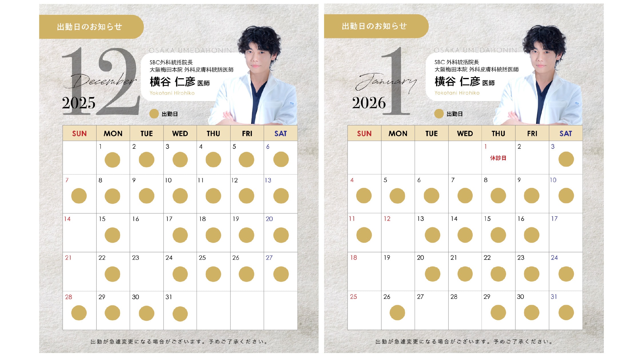二重整形のプレミアムDr. 横谷医師の医師出勤カレンダー