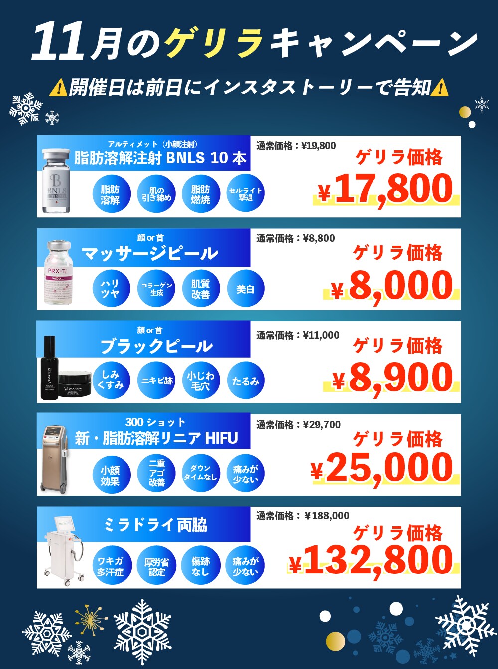 ※ゲリラキャンペーン価格は開催当日にご来院、処置が可能な方のみが対象です。開催日以外は通常価格でのご案内となります。