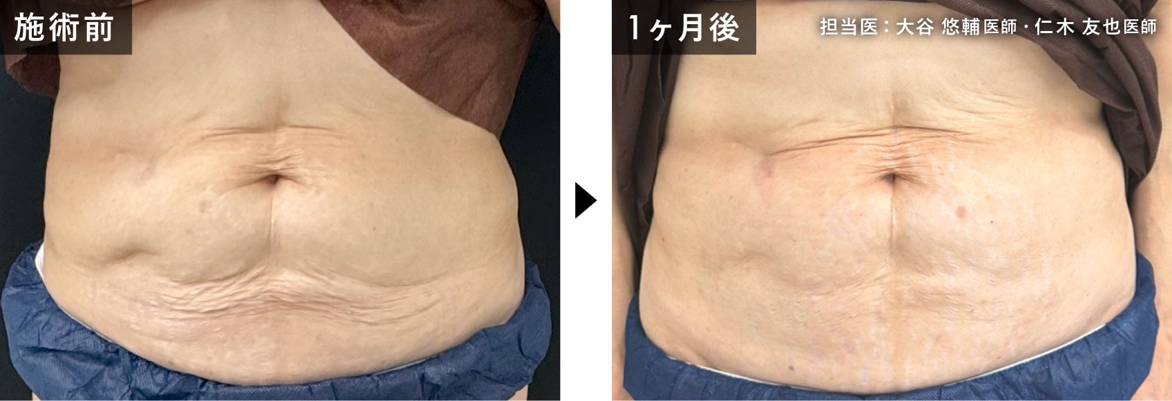 皮膚のたるみが強いため皮膚切除やエンブレイスRFといった外科手術が適応ではありますが、少しの引き締めでよいとモフィウスボディをお受けいただきました。