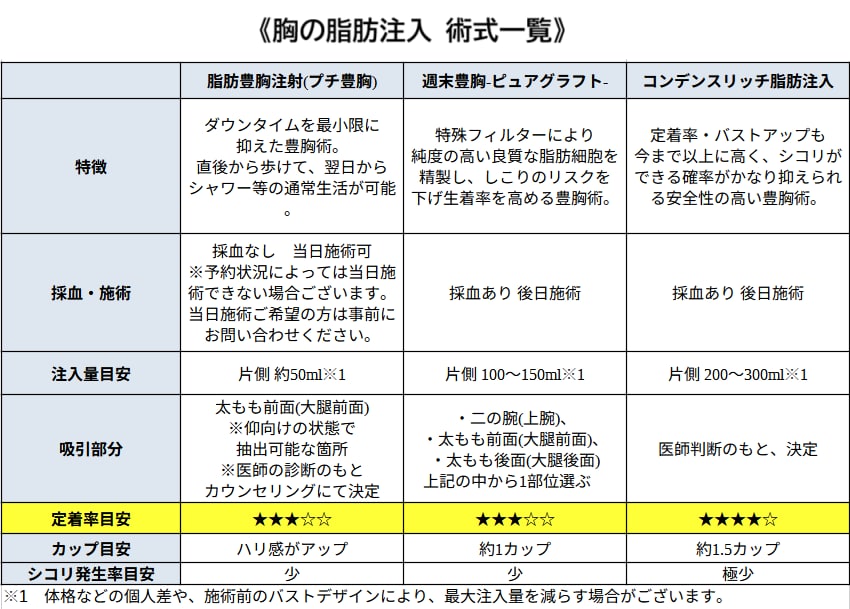 どのくらいボリュームアップしたいのかにもよりますが、術式によって脂肪の定着率も異なります。