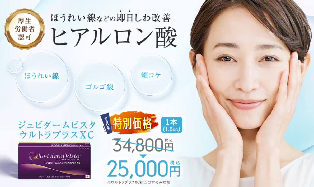 ジュビダームビスタ ウルトラプラスXCの特徴 ✅「しわ・たるみを内側からリフトアップ」 弾力と適度な硬さを持つため、ほうれい線やマリオネットラインを内側からしっかり持ち上げます。 ✅「質感がなめらか」 なめらかなジェルになっており、表情の動きに合わせて馴染むため、 不自然な仕上がりになる心配がありません。 ✅「安心の国内承認品」 国内で唯一、美容医療におけるシワ治療のヒアルロン酸として厚生労働省から承認を得ています。 ----- よくある質問 ----- 💭痛みはありますか 注入時にはチクッとした痛みを感じることがあります。 💭ダウンタイムはありますか ほとんどありません。 施術直後は、注入部位に軽度の赤みや腫れ、内出血が出ることがありますが、 通常は数時間から数日程度で自然に引いていきます。 💭効果はどれくらい持続しますか 一度の施術で約1年間にわたる自然な美しさが続きます。 定期的なメンテナンスで、お顔の土台を整え、効果をより長く保つことが可能です。 --------------------- 📩 ご予約・無料カウンセリングはお早めに! 人気のキャンペーンのため、早めのご相談がおすすめです🌿