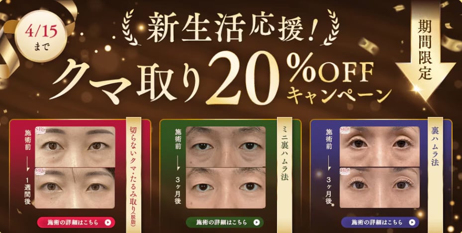【クマ取り最大44%OFF】(~4/15) ★目の下の切らないクマ取り(脱脂単体) 今だけ63,280円‼️ ★裏ハムラ法 通常価格380,000円 ➡ 304,000円 👆通常価格より8万円以上お得🉐‼️ 👇さらにモニター施術なら、通常価格より44%OFF✨👇 通常価格380,000円 ➡ 期間限定モニター価格 212,800円‼️✨ ※福山医師はクマ取りプレミアムドクターのため、裏ハムラ法のみ対象です 新生活スタート前に目元の印象を明るく変えませんか?💓