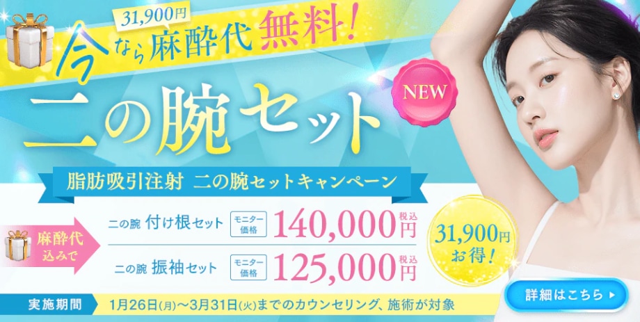 【脂肪吸引注射 二の腕セット👈3万円分の麻酔代無料‼️】(~3/31) 脂肪吸引注射に人気部位のセットメニュー ★二の腕付け根セット ★二の腕振袖セット が新登場✨ 新メニュー登場を記念して 31,900円分の麻酔代を無料でご提供します🎁✨【婦人科形成術 最大32%OFF✨】(カウンセリング~3/31、施術~4/15) 今話題の”婦人科形成術”🌷 ★7days法(抜糸無し)小陰唇縮小術 通常価格257,800円 ➡ 206,240円 ""20%OFF"" ★7days法小陰唇縮小術+7days法副皮除去術 通常価格492,100円 ➡ 354,312円 ""28%OFF"" ★7days法小陰唇縮小術+7days法副皮除去術+7days法陰核包茎術 通常価格688,030円 ➡ 467,860円 ""32%OFF"" ==================== ==================== ⭐お知らせ⭐ 2/2より脂肪豊胸の新メニュー【SBCリッチ豊胸】開始👙✨