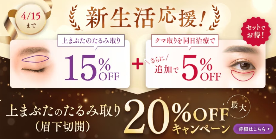 【上まぶたのたるみ取り 最大20%OFFキャンペーン】(~4/15) ★上まぶたのたるみ取り(眉下切開)単体で モニター価格189,000円 ➡ 160,650円👈15%OFF‼️ さらに クマ取りと同時施術の場合+5%OFF‼️ 上まぶた+下まぶた同時施術で一気に目元の印象を変えるのがオススメです💓