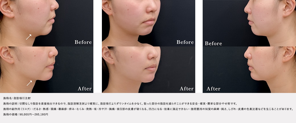 あご下の脂肪吸引注射: ダイエットでは落ちにくい、首との境目を邪魔する脂肪をピンポイントで除去しました。