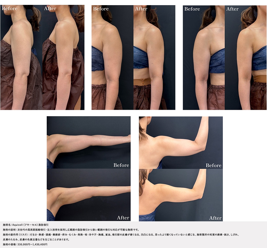 "傷バレするのが嫌だ"という方には、リクエストに応じて肘の傷なし、脇からのみで脂肪吸引で仕上げることも可能です。