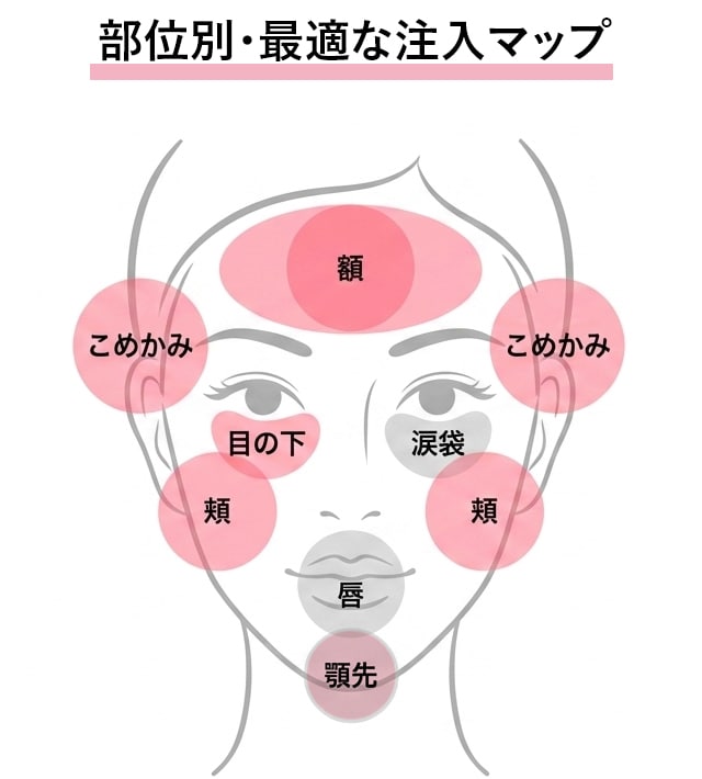 | 額・こめかみ | 多量の注入が可能。ハリを出してシワも改善。 |