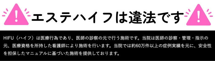 エステ用に出力を落としたエステハイフ機器でさえも、トラブルが起こることもあり国民生活センターなどへの相談も増えています。令和6年6月7日付けの厚生労働省発表の文書でも、エステサロンでのHIFU(ハイフ)に関する注意喚起の旨が記されています。