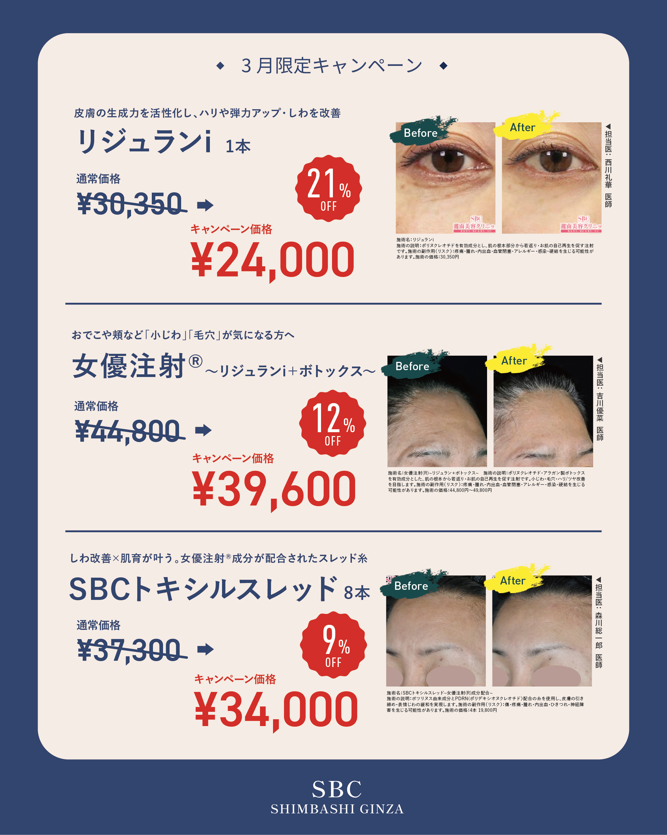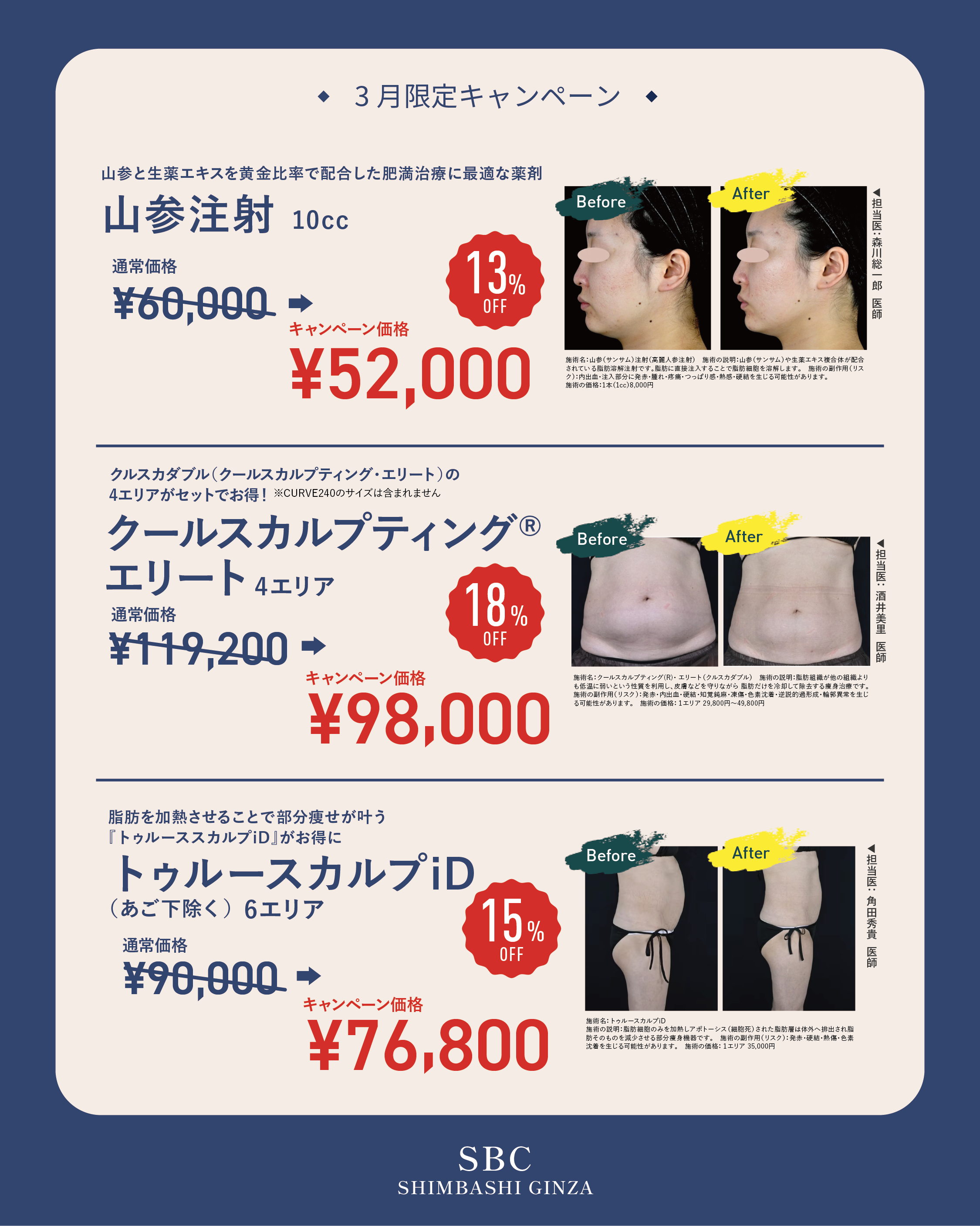 今月は、目元の若返りで人気の「リジュランi」や、ツヤ肌を叶える「女優注射」、さらに薄着になる季節を前にした「クールスカルプティング」など、今だけの大特価でご用意しました!