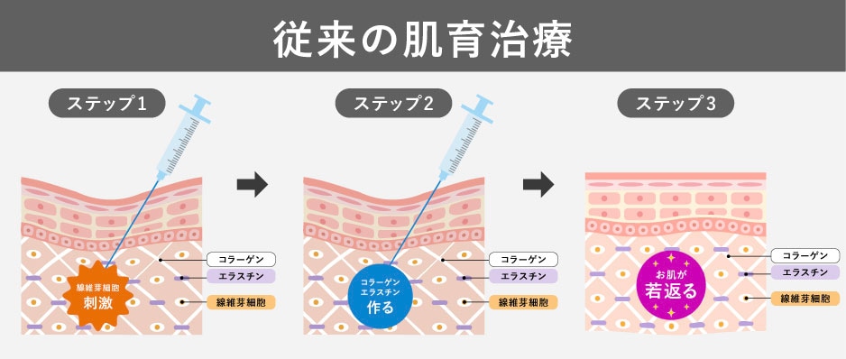 これまでの肌育治療は、線維芽細胞を刺激して自力のコラーゲン生成を待つのが主流でした。しかし、今の時代は「コラーゲンをそのまま補給する」のが最短ルート!