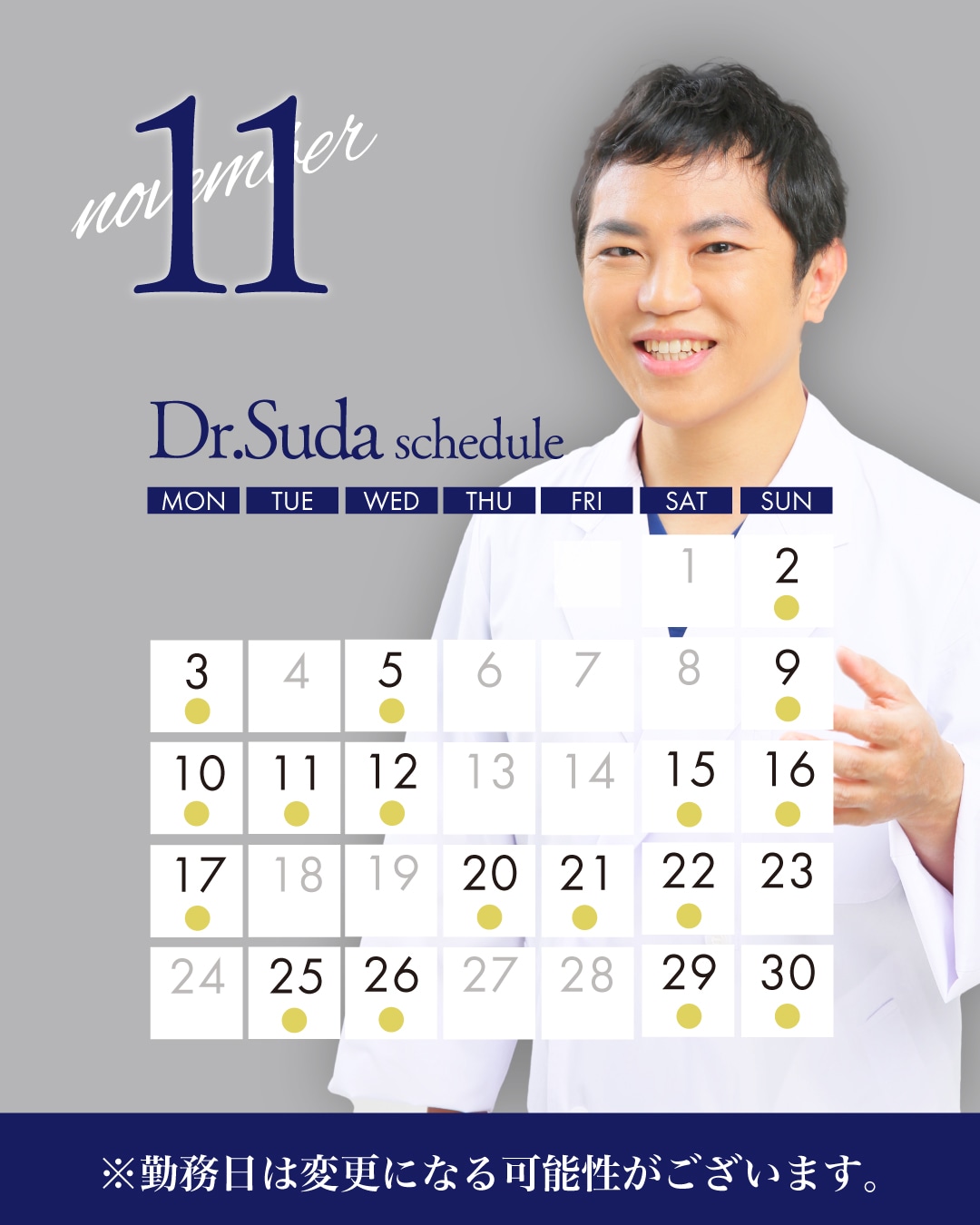 11月の出勤日も一緒にチェックして、ぜひ11月中にお気軽にご予約・ご相談ください。