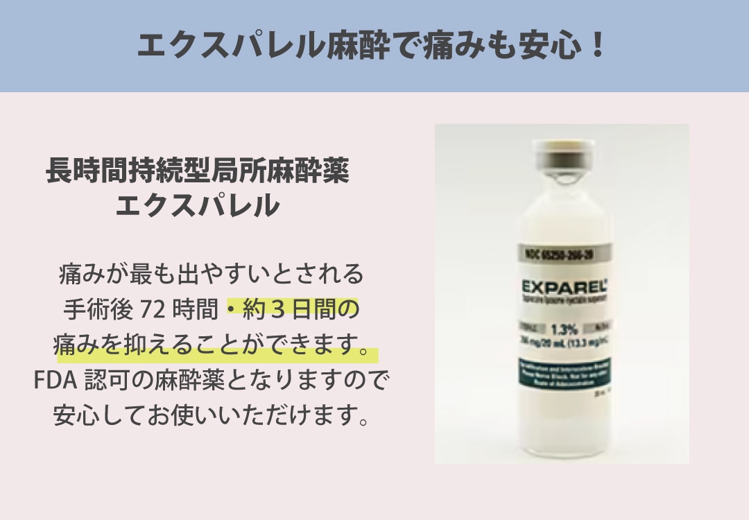 手術後はどうしても痛みが伴いますが、エクスパレル麻酔を併用することで痛みを感じやすい術後3日間の痛みを抑えることが可能です。