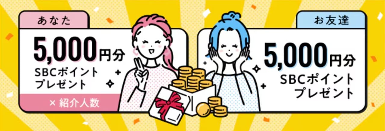 SBCメディカルグループにまだ来院したことがないお友達に当院をご紹介いただき、ご友人が当院で施術を受けていただくと、ご紹介した方もされた方どちらにも5,000ポイントをプレゼント♡ 付与されたポイントは1point=1円からご使用可能!施術やスキンケア商品などのお会計時にご利用いただけます。 お友達の紹介人数に限りはございません。みんな嬉しいお友達紹介制度、ぜひご活用ください!