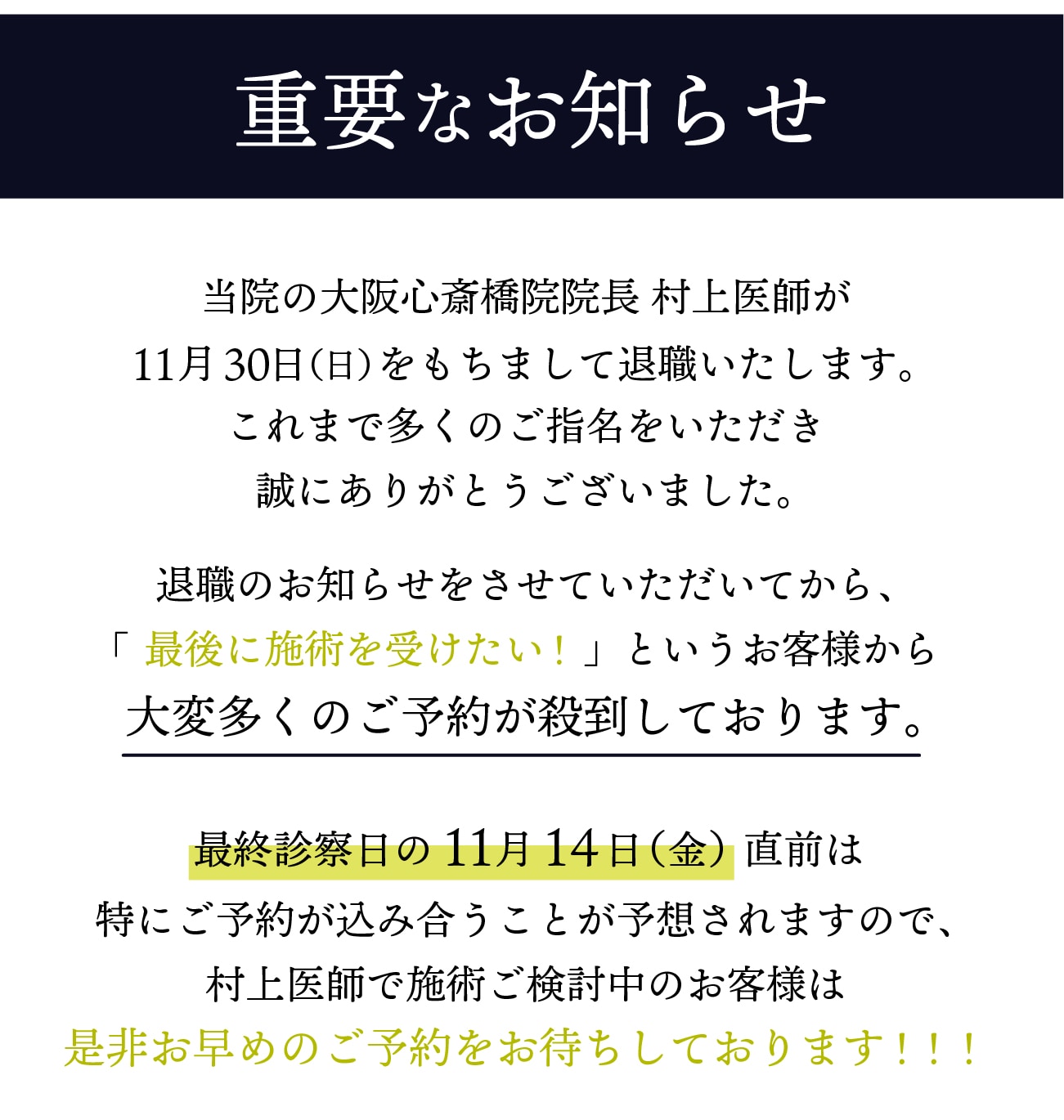 関西エリアで目元施術といえば!の大阪心斎橋院院長 村上医師が、この度湘南美容クリニックを退縮することとなりました。
