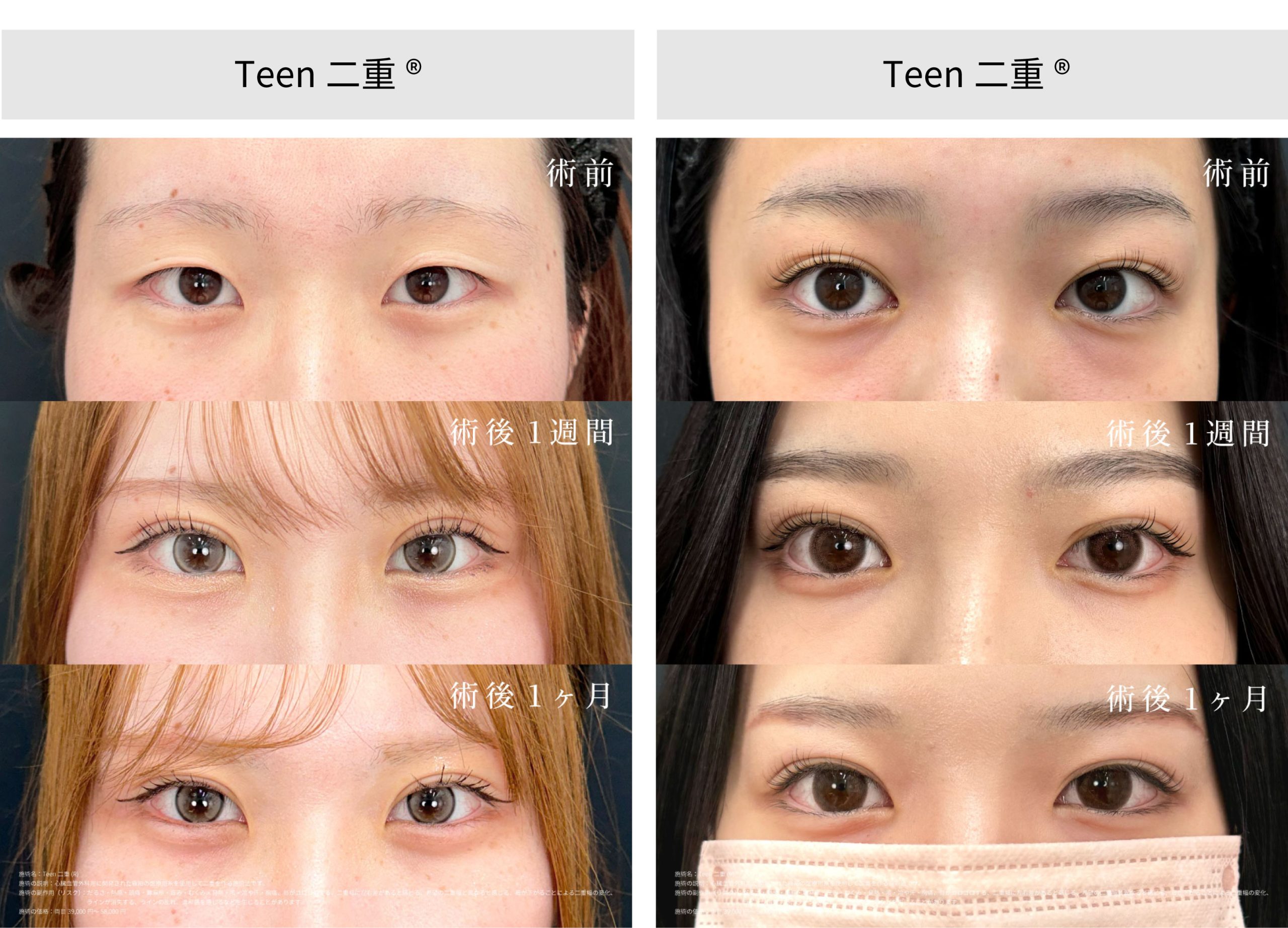 Teen二重®は、皮膚の表面に小さな傷をつけて糸を通す「表留め」 の施術です。糸の通し方が特徴的で、三角形に糸を作って留める「トライアングル型」という方法で行います。