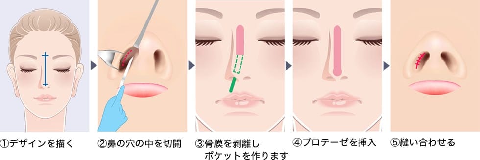 ★鼻の穴の中を切開し、プロテーゼ挿入後に縫合。