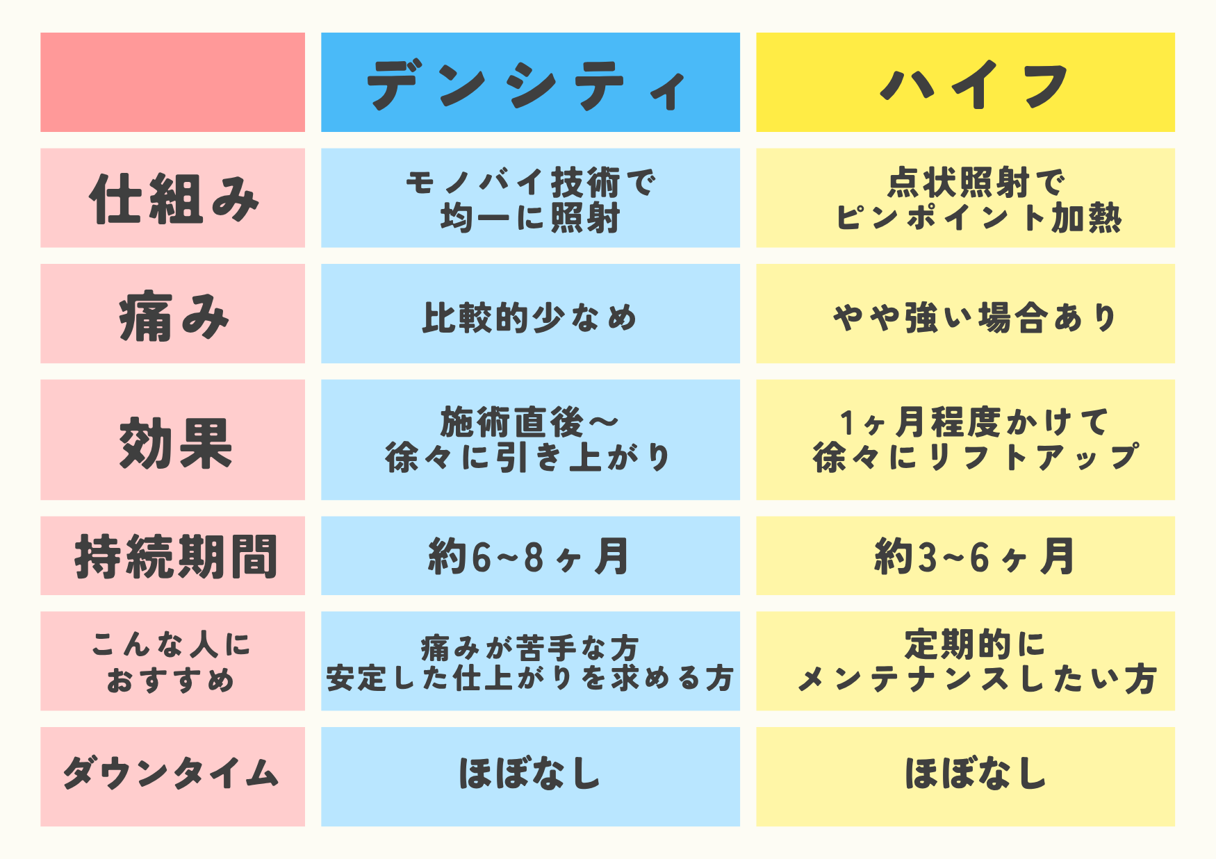 持続期間:HIFUが約3〜6ヶ月なのに対し、デンシティは約6〜8ヶ月と長持ちしやすいのが特徴です。
