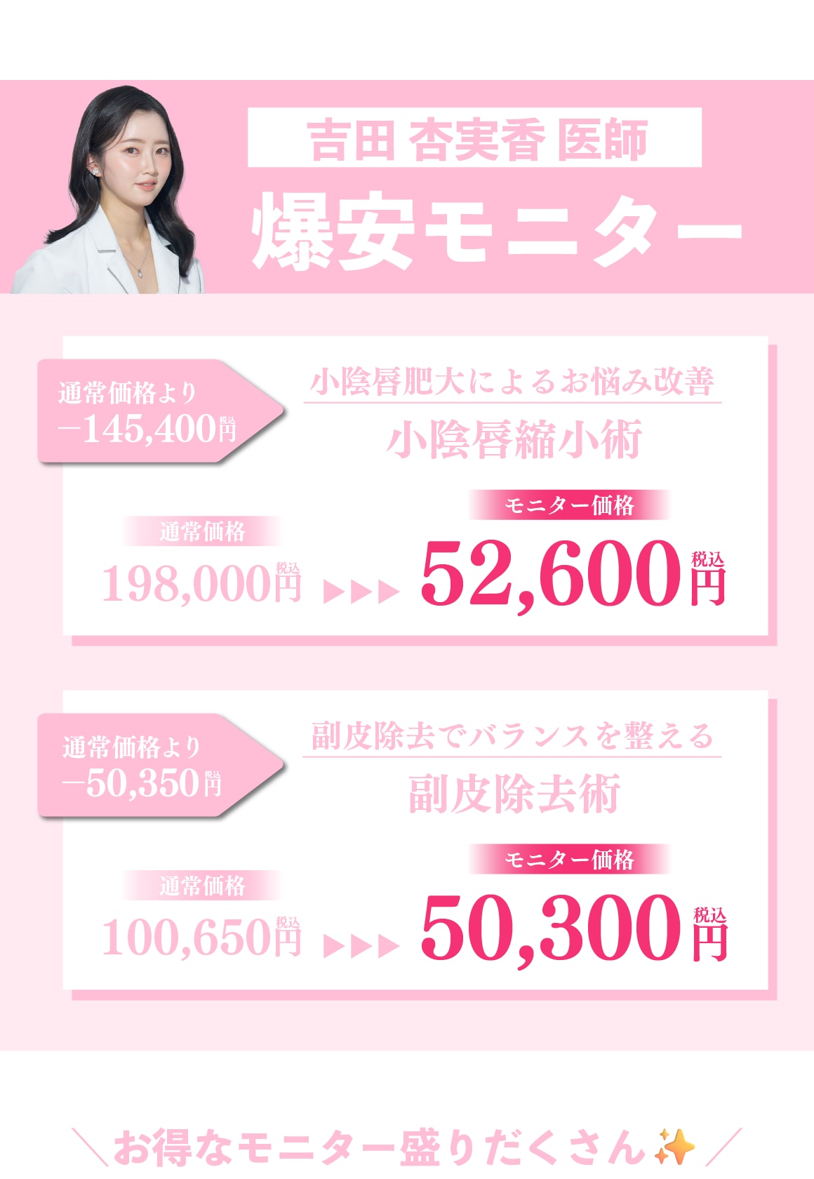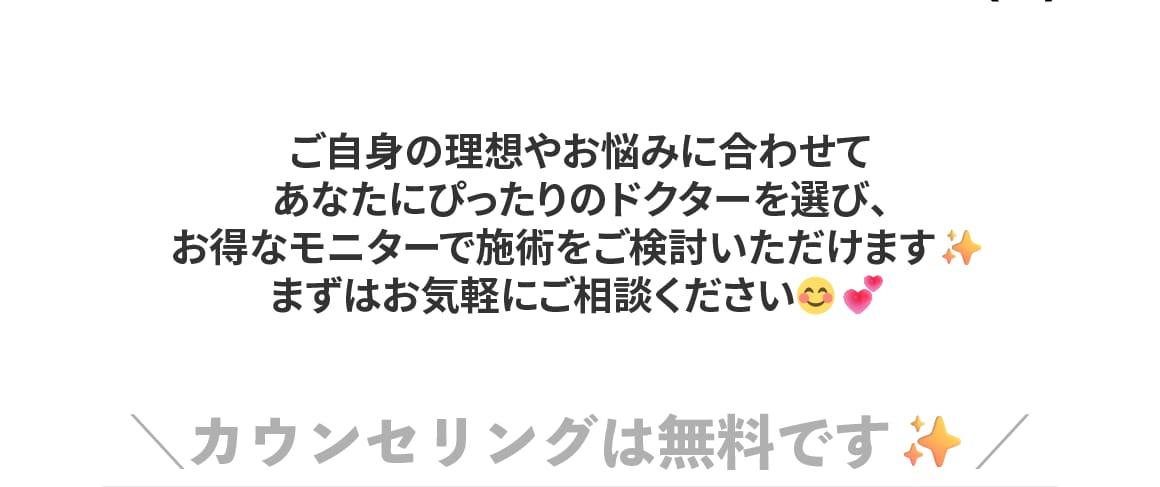 当院では、脂肪吸引/糸リフト/脂肪注入/目の下のクマ取りをはじめとした若返り/二重整形/婦人科形成(女性器の整形)/ワキガ・多汗症治療/メディカルダイエット/ハイフ/美肌・レーザー治療/医療脱毛と幅広い施術を取り扱っております。