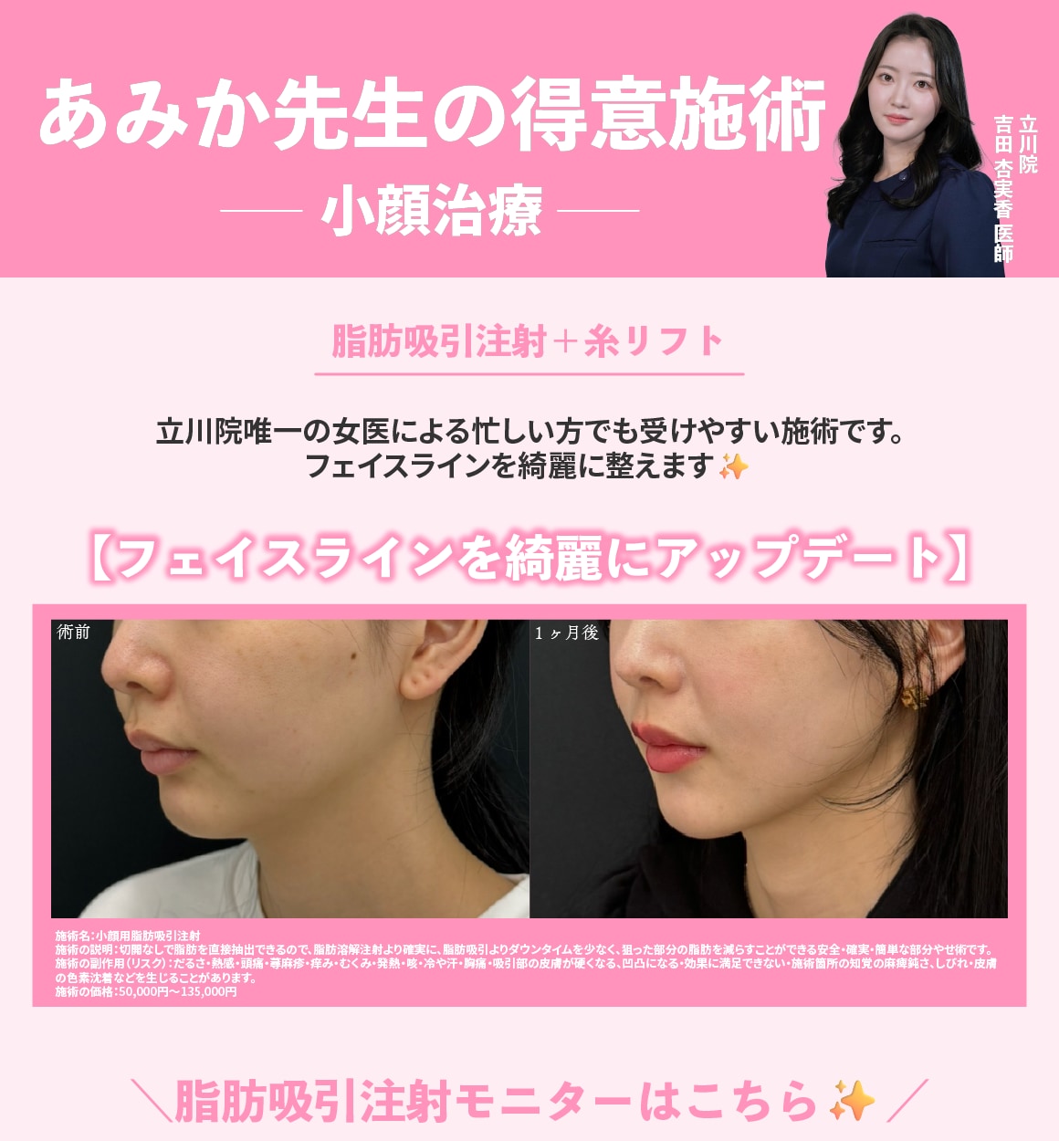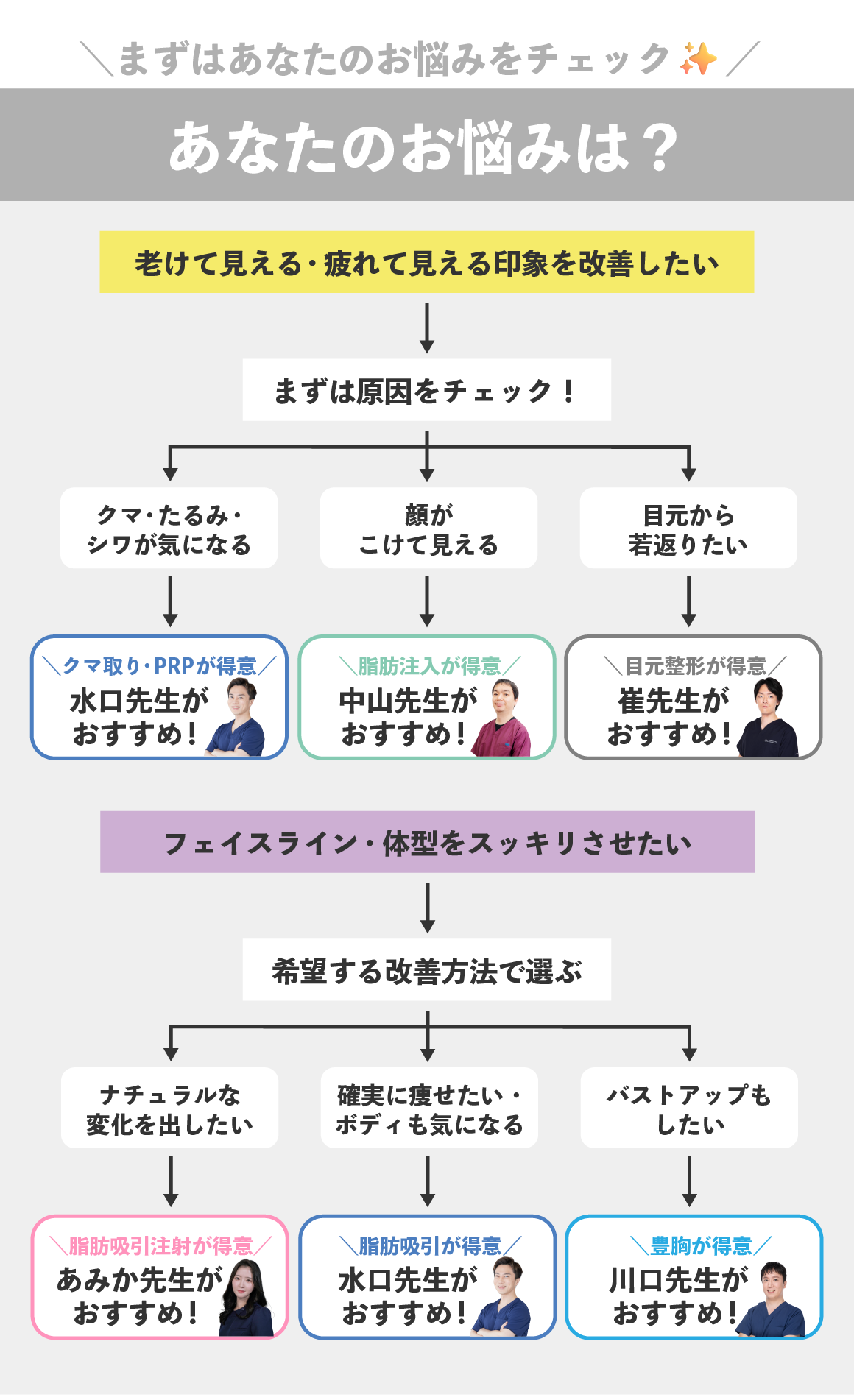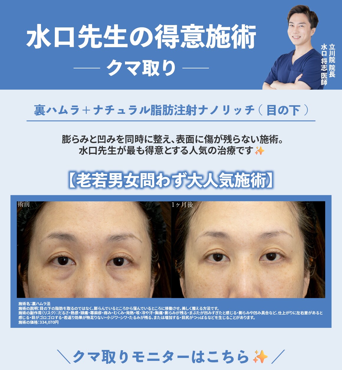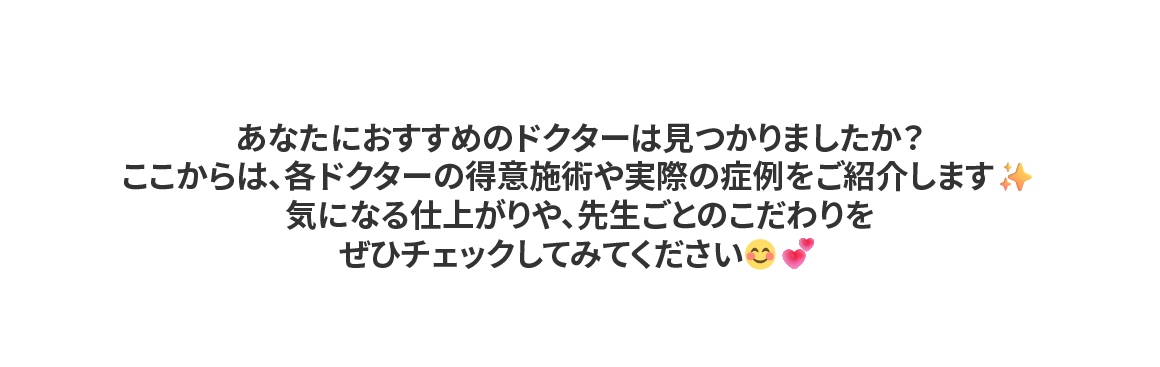 当院では、脂肪吸引/糸リフト/脂肪注入/目の下のクマ取りをはじめとした若返り/二重整形/婦人科形成(女性器の整形)/ワキガ・多汗症治療/メディカルダイエット/ハイフ/美肌・レーザー治療/医療脱毛と幅広い施術を取り扱っております。