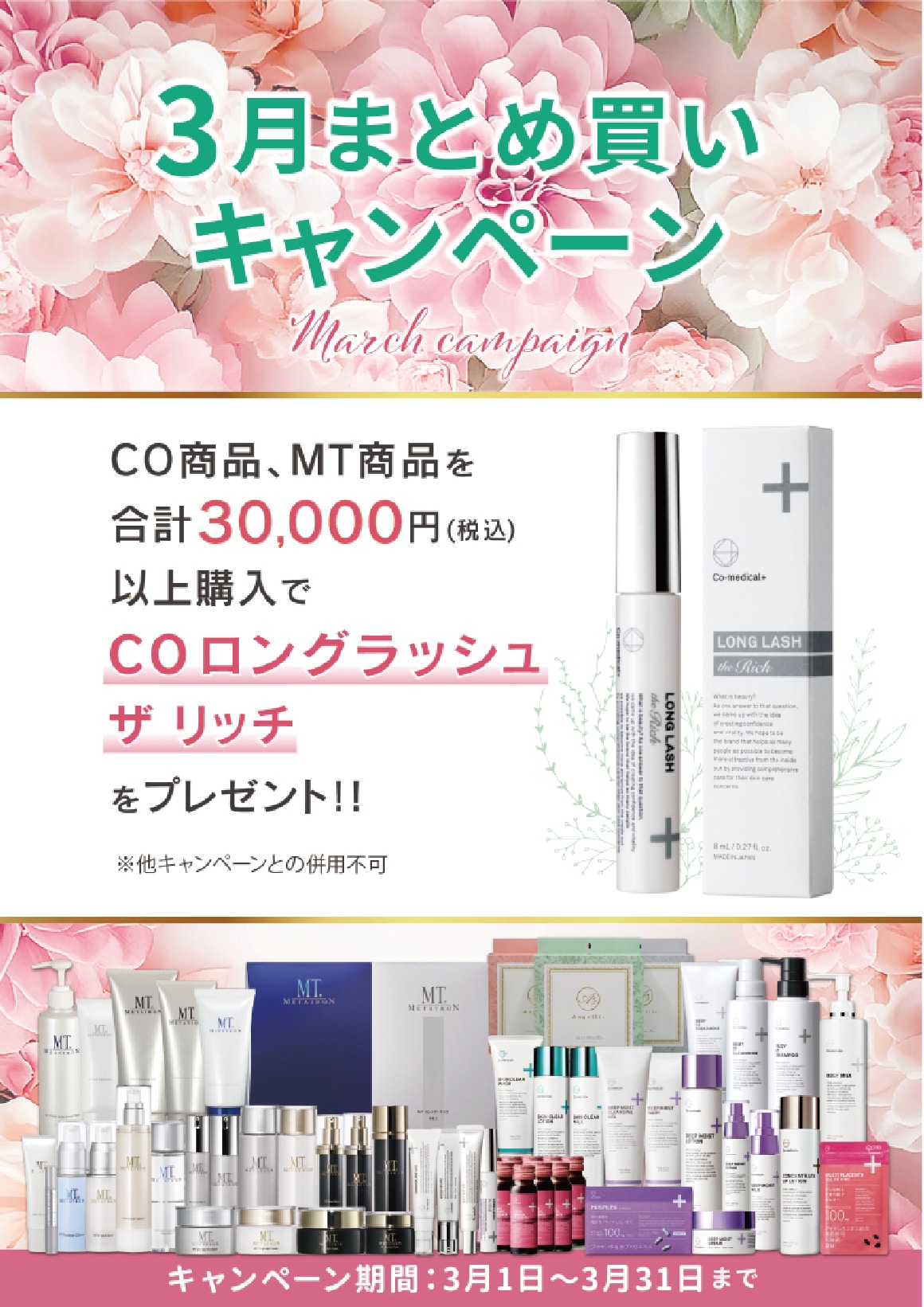 MT商品・CO商品を 合計30,000円(税込)以上購入で COロングラッシュザリッチ をプレゼント!!※他キャンペーンとの併用不可 ドクター出勤カレンダー👨⚕️