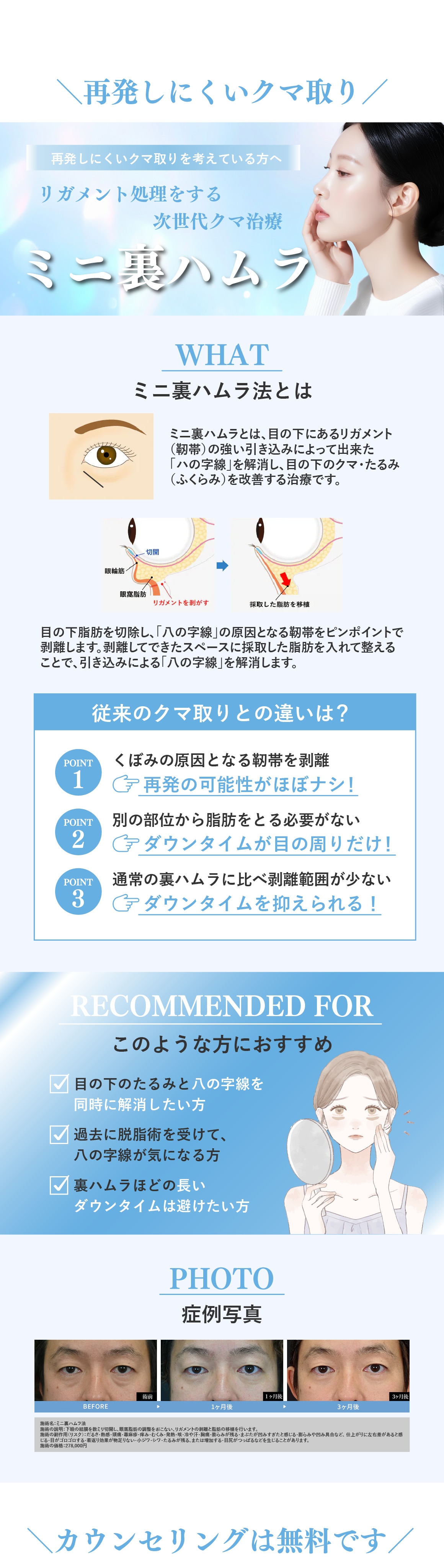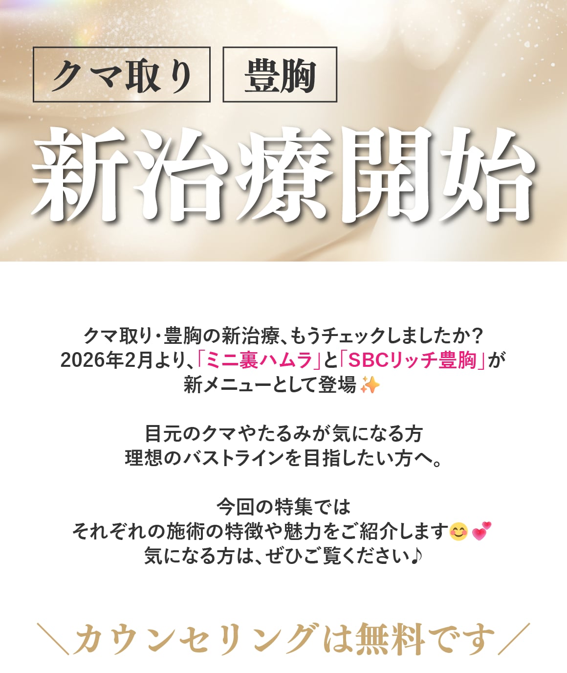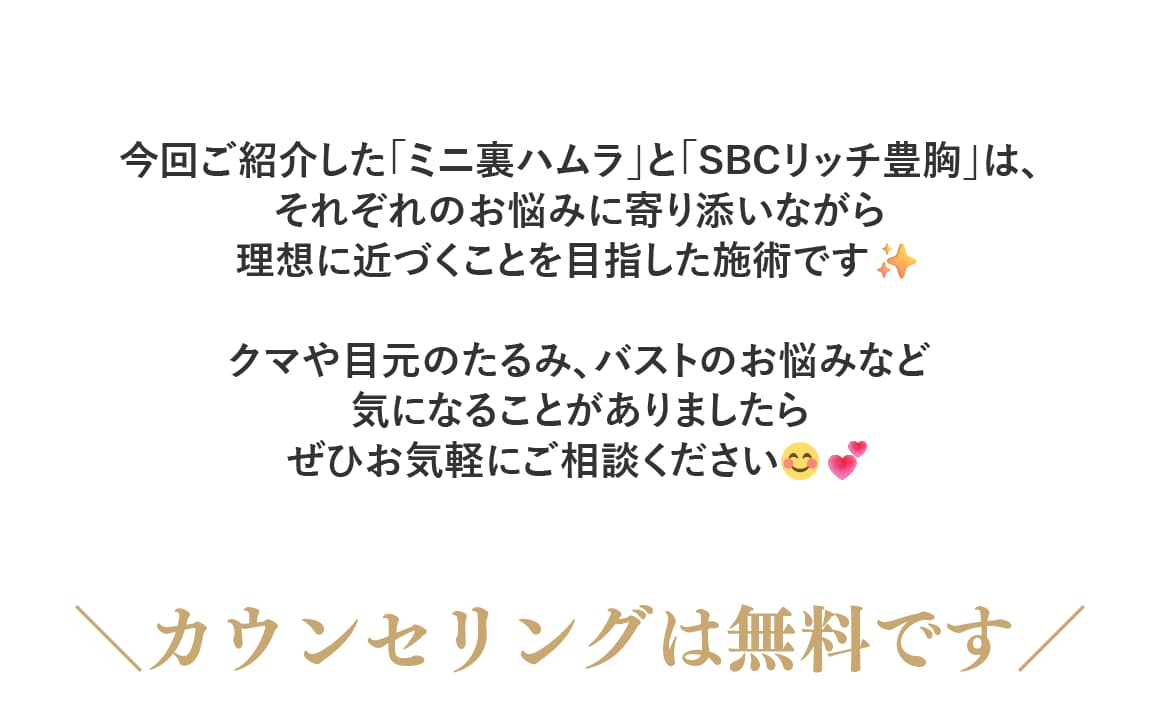当院では、脂肪吸引/糸リフト/脂肪注入/目の下のクマ取りをはじめとした若返り/二重整形/婦人科形成(女性器の整形)/ワキガ・多汗症治療/メディカルダイエット/ハイフ/美肌・レーザー治療/医療脱毛と幅広い施術を取り扱っております。
