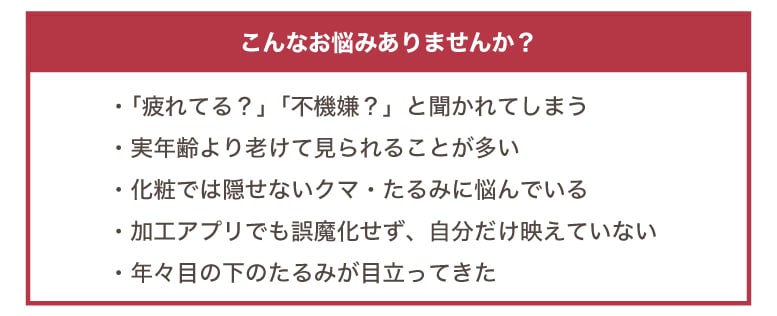 目の下の切らないクマ・たるみ取りは20代から幅広い層に人気の施術です。
