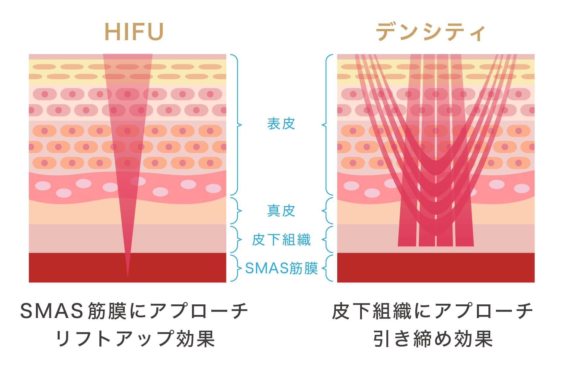 一方、デンシティは高周波を用いて皮膚の浅い層〜深い層まで広く熱を与え、柔らかい皮膚をギュッと引き締める効果があります。