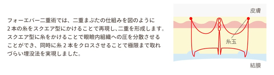 髪の毛よりも細い極細の医療用糸で二重まぶたの仕組みを再現し、二重を形成します。