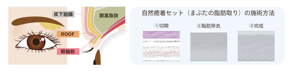 加えてまぶたをほんの数ミリ程度切開し、余分な脂肪や筋肉を除去をすることですっきりとしたまぶたに仕上げます。